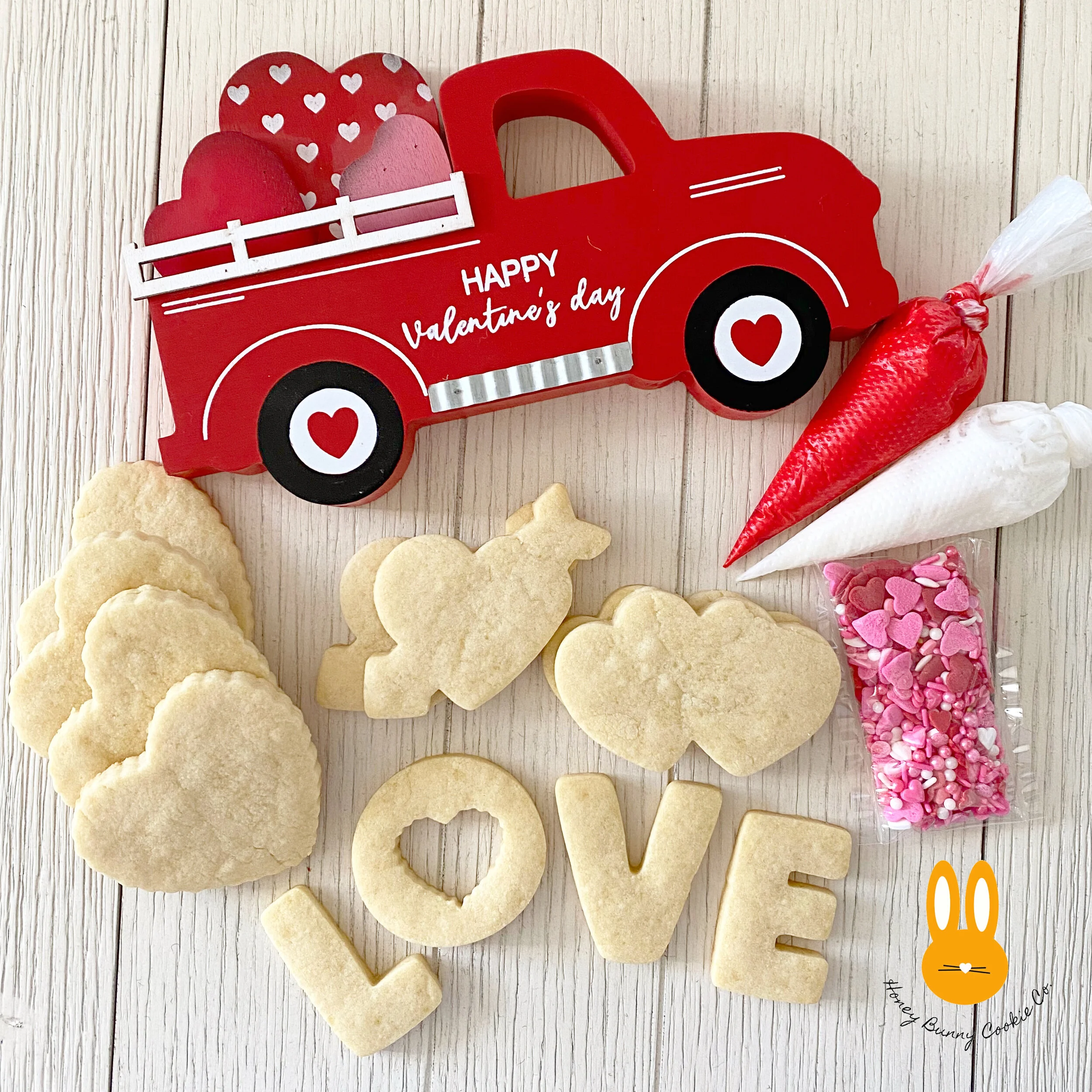 12 Signature Vanilla Sugar Cookies, 3 Bags of Royal Icing, 6 Toothpicks, Instruction Guide, and Valentine’s Sprinkles!
